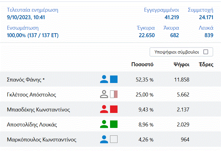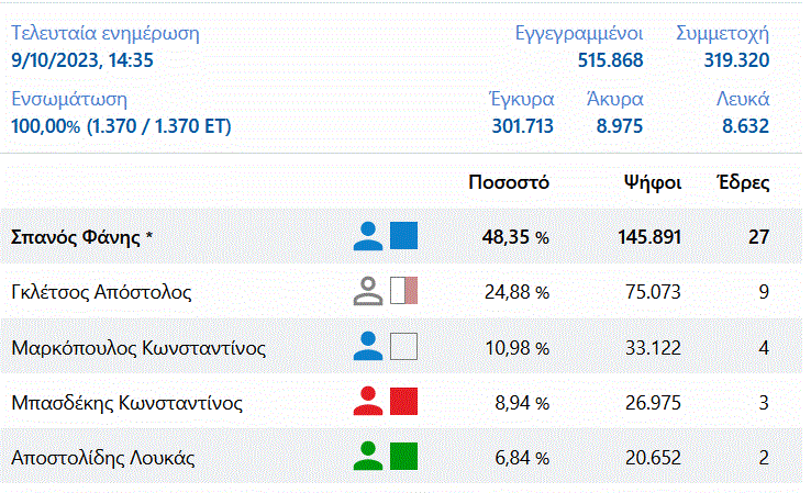 Με ποσοστό 48,35 % ο υποψήφιος της ΝΔ και εν ενεργεία Περιφερειάρχης Στερεάς Ελλάδας Φάνης Σπανός κέρδισε από τον πρώτο γύρο.