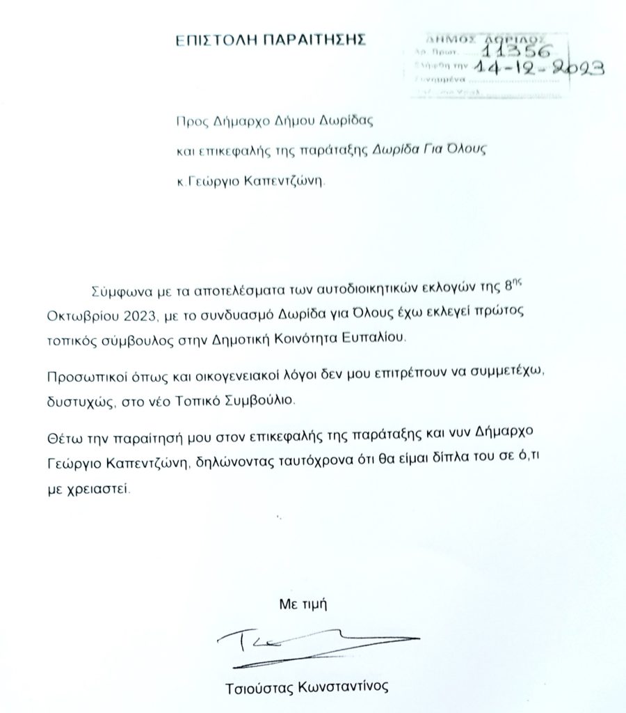Την παραίτησή του υπέβαλε σήμερα ο νυν Πρόεδρος του Ευπαλίου Κώστας Τσιούστας στο Δήμαρχο Γιώργο Καπεντζώνη, από το νέο Τοπικό Συμβούλιο που είχε εκλεγεί πρώτος με το ψηφοδέλτιο της παράταξης “Δωρίδα για Όλους”.