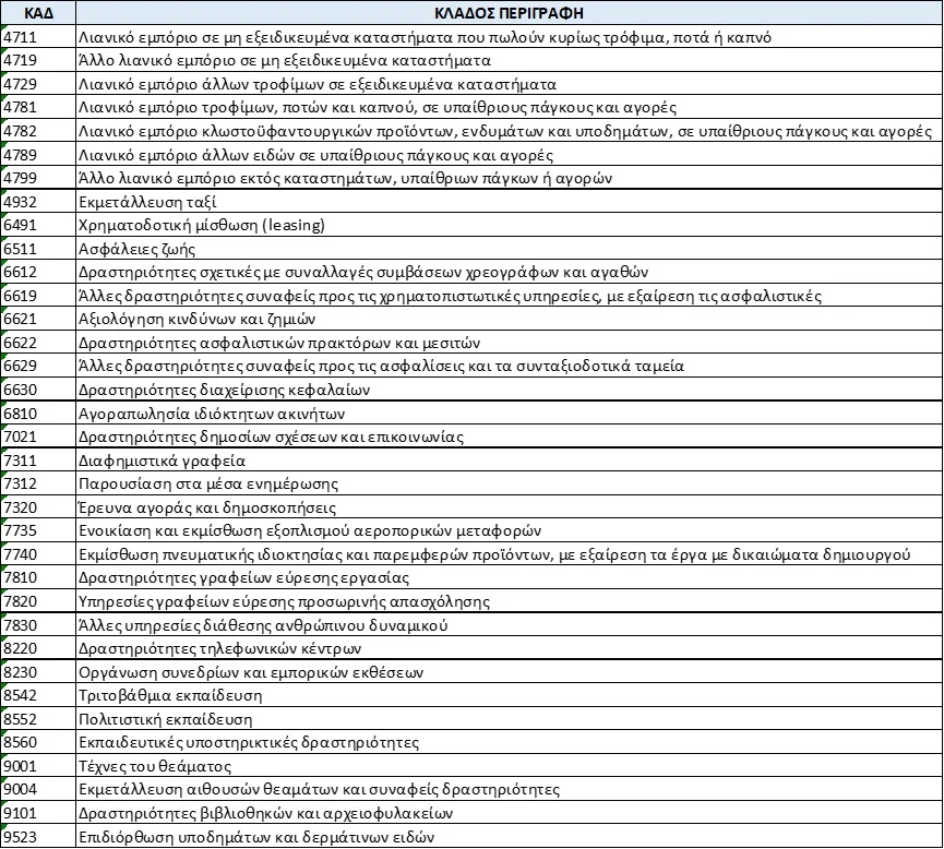 Οι νέοι ΚΑΔ είναι οι εξής :