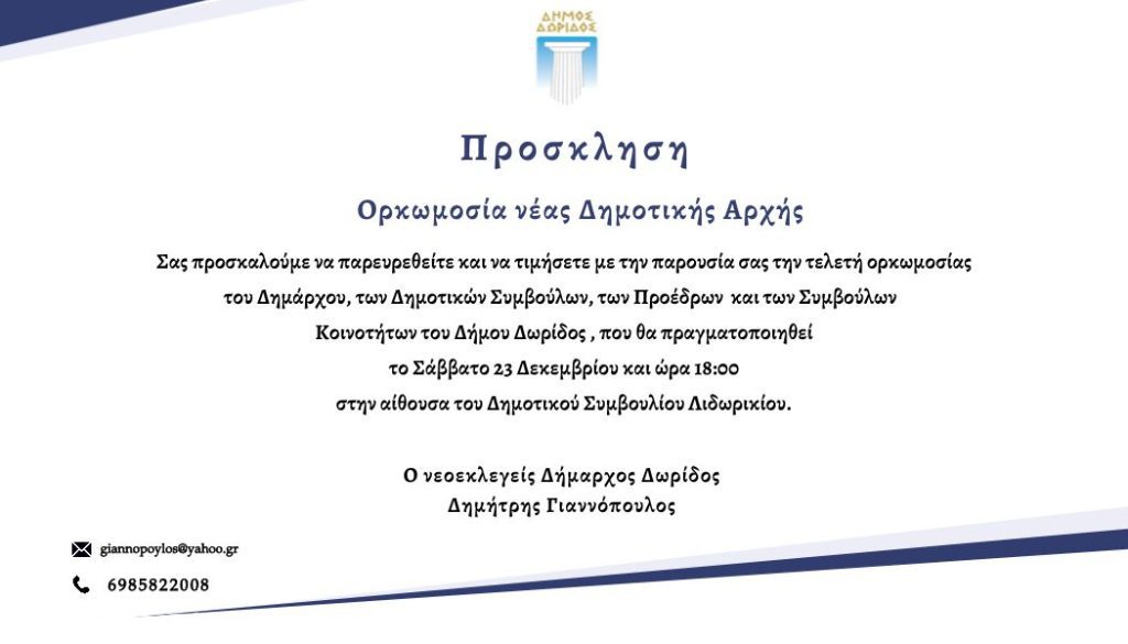 Το Σάββατο 23 Δεκεμβρίου και ώρα 18:00 θα πραγματοποιηθεί η τελετή ορκωμοσίας του νέου Δημάρχου, Δημοτικών Συμβούλων, Προέδρων και Τοπικών Συμβούλων τού Δήμου Δωρίδος.