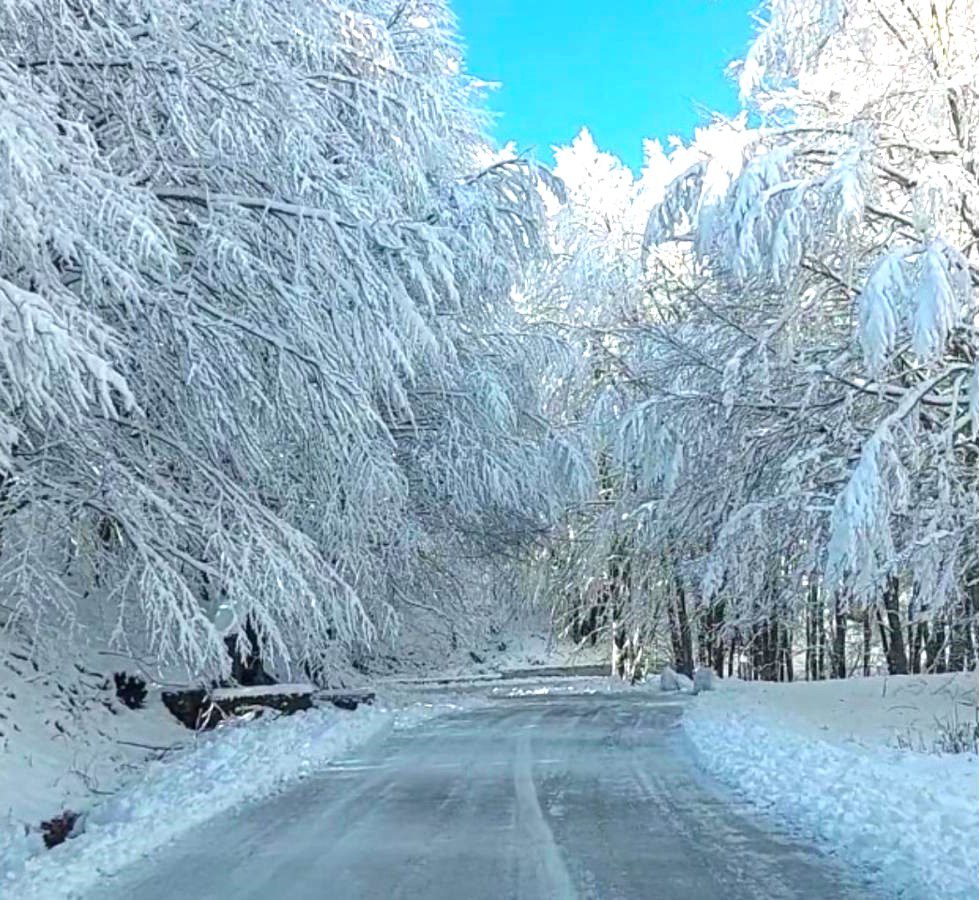 Την πιο εντυπωσιακή εκδοχή ενός ατελείωτης ομορφιάς δρόμου ανέδειξε το χιόνι που σκέπασε τα δέντρα και «παντρεύτηκε» αρμονικά με το γαλάζιο του ουρανού.