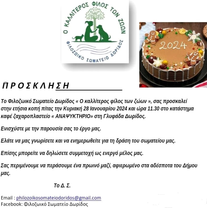 Κοπή Πίτας και Παζάρι Φιλοζωικού Σωματείου Δωρίδας “Ο Καλλίτερος Φίλος των Ζώων”,στις 28 Ιανουαρίου 2024 ΚΟΙΝΩΝΙΚΑΠΟΛΙΤΙΣΜΟΣ Από doridanews Στις Ιαν 24, 2024 Share - Διαφήμιση -Χρόνος ανάγνωσης: 1 λεπτό Συνεχίστε να διαβάσετε- Διαφήμιση - Share
