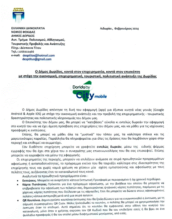 Την εφαρμογή αυτή θα μπορεί να την «κατεβάσει» εύκολα και δωρεάν ο επισκέπτης και κάθε ενδιαφερόμενος και μέσω αυτής θα έχει πρόσβαση στις επιχειρήσεις που δραστηριοποιούνται στην περιοχή του Δήμου Δωρίδος, λαμβάνοντας όλες τις διαθέσιμες σχετικές πληροφορίες. Επίσης, θα έχει τη δυνατότητα να ενημερωθεί για όλα τα «μυστικά» του τόπου, τις περιοχές ιδιαίτερου φυσικού κάλλους, τις μαγευτικές παραλίες και τα αλπικά τοπία, την πολιτισμική κληρονομιά και παράδοση, την ιστορία καθώς και όλες τις δράσεις και εκδηλώσεις που πραγματοποιούνται στην ευρύτερη περιοχή.
