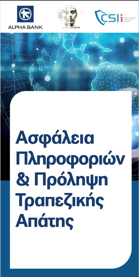 Παρουσίαση με θέμα «Ασφάλεια Πληροφοριών και Πρόληψη Τραπεζικής Απάτης» θα πραγματοποιηθεί από το CSI Institute (Διεθνές Ινστιτούτο για την Κυβερνοασφάλεια), την Πέμπτη 21 Μαρτίου 2024 και ώρα 18:30 – 20:00, στο Πνευματικό Κέντρο της Άμφισσας.