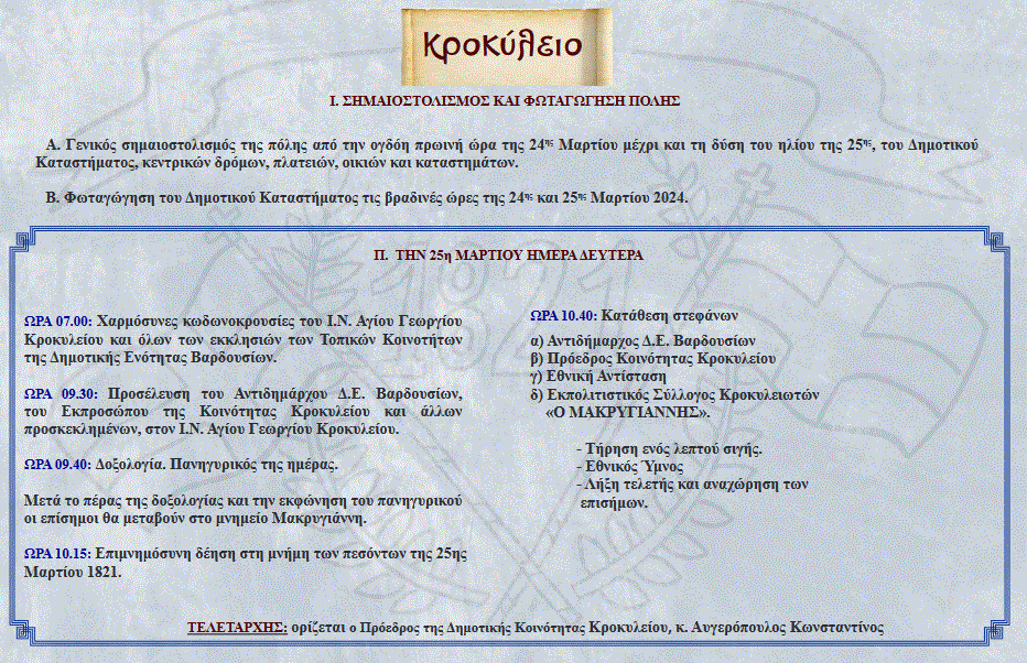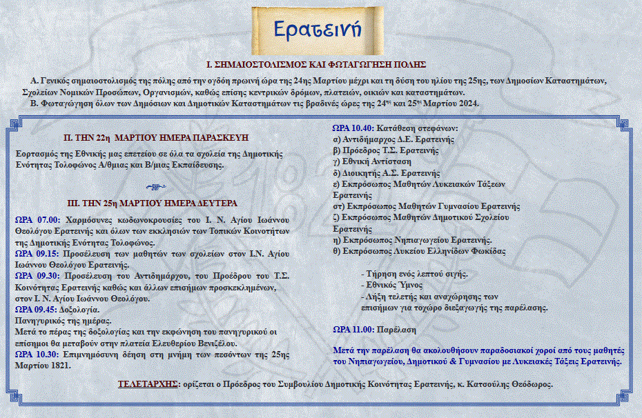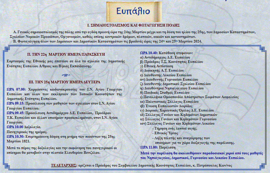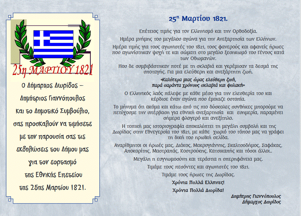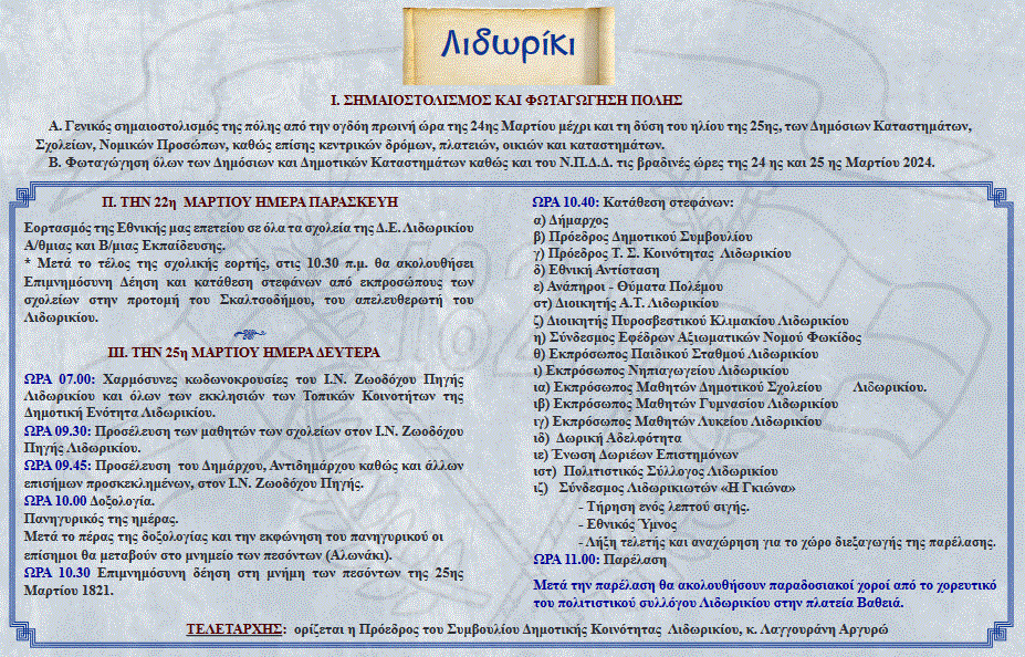 25η ΜΑΡΤΙΟΥ 2024 : Το πρόγραμμα των επετειακών εκδηλώσεων στο Δήμο Δωρίδας ΔΗΜΟΤΙΚΑ Από doridanews Στις Μαρ 23, 2024 Share - Διαφήμιση -Χρόνος ανάγνωσης: 3 λεπτά Συνεχίστε να διαβάσετε- Διαφήμιση - Share