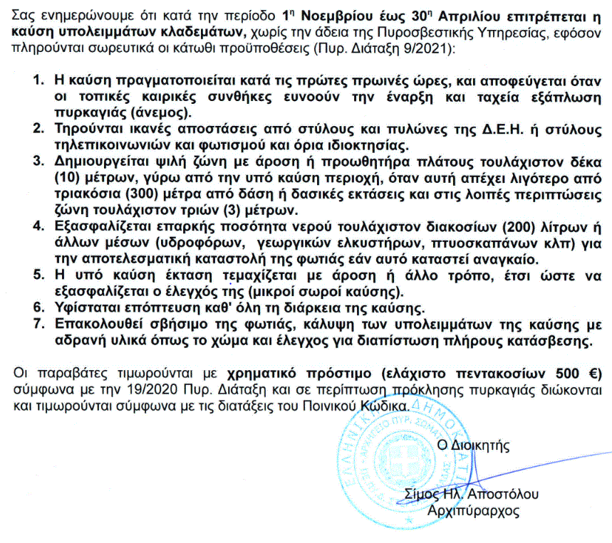 Με ανακοίνωση η Διοίκηση της Πυροσβεστικής Υπηρεσίας ενημερώνει τους πολίτες ότι η καύση των διαφόρων χορταριών για καθαρισμό των οικοπέδων και χωραφιών επιτρέπεται μέχρι στις 30 Απριλίου.