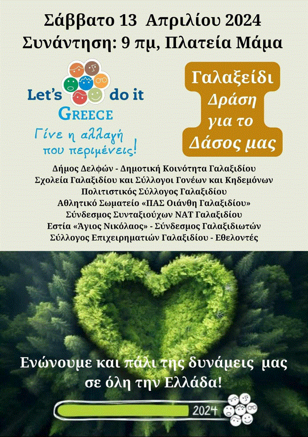 Ο Δήμος Δελφών και η Δημοτική Κοινότητα Γαλαξιδίου στηρίζουν συμμετέχοντας στην εκστρατεία «Let’s do it Greece 2024», καλώντας μικρούς και μεγάλους να δώσουν το παρών, το Σάββατο 13 Απριλίου 2024, στη δράση καθαρισμού που θα λάβει χώρα στην περιοχή του Γαλαξιδίου.
