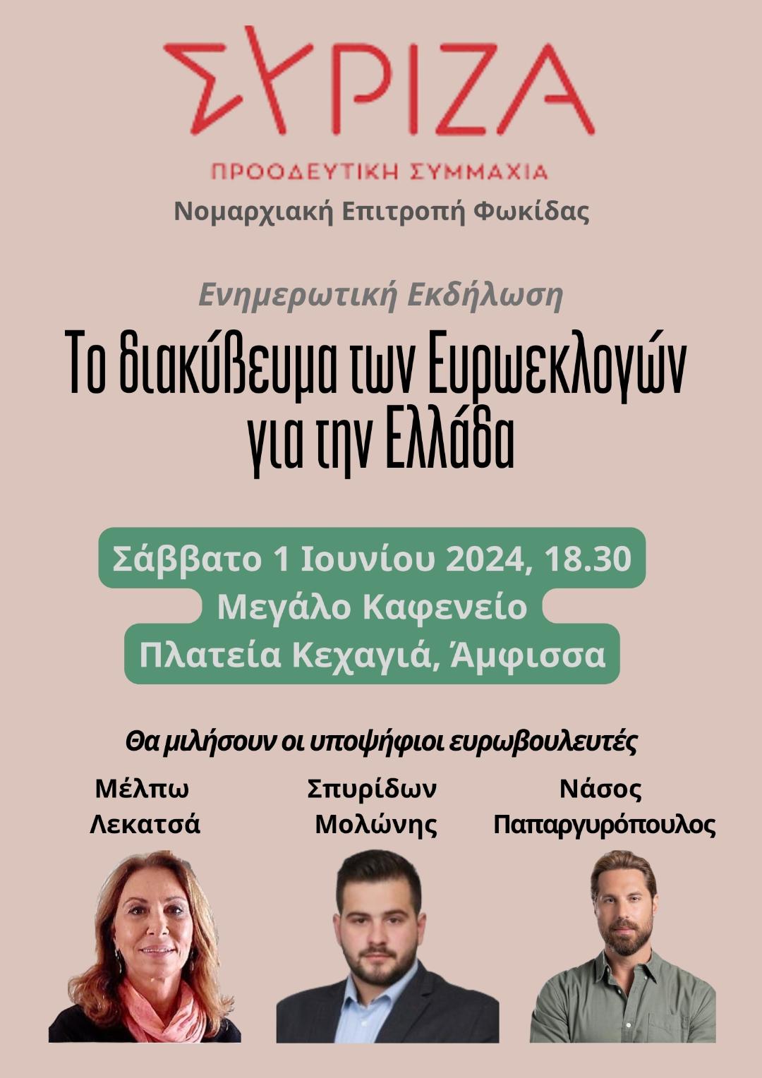 Ομιλία υποψηφίων ευρωβουλευτών του ΣΥΡΙΖΑ – ΠΣ σήμερα Σάββατο στην Άμφισσα ΠΟΛΙΤΙΚΑ Από doridanews Στις Μάι 31, 2024 Share - Διαφήμιση -Χρόνος ανάγνωσης: 1 λεπτό Συνεχίστε να διαβάσετε- Διαφήμιση - Share