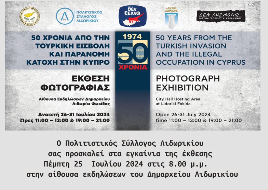 Φιλοξενούμε την επετειακή έκθεση φωτογραφίας της “Ομοσπονδίας Κυπριακών Οργανώσεων Ελλάδας” και του Ιδρύματος “ΔΕΝ ΛΗΣΜΟΝΩ” στην αίθουσα εκδηλώσεων του Δημαρχείου Λιδωρικίου από 26 έως 31 Ιουλίου 2024.