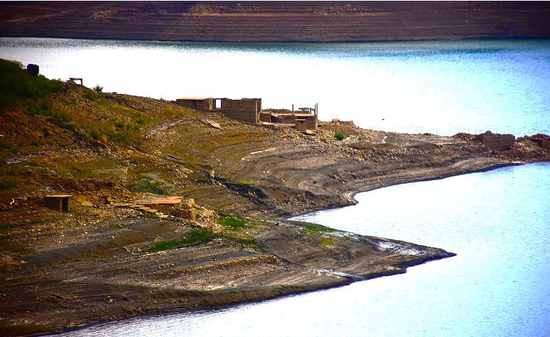 Φράγμα Μόρνου. Τα σπίτια από το βυθισμένο χωριό Κάλλιο χάσκουν σαν φαντάσματα έξω από το νερό και πολύ ψηλότερα από τη στάθμη του.