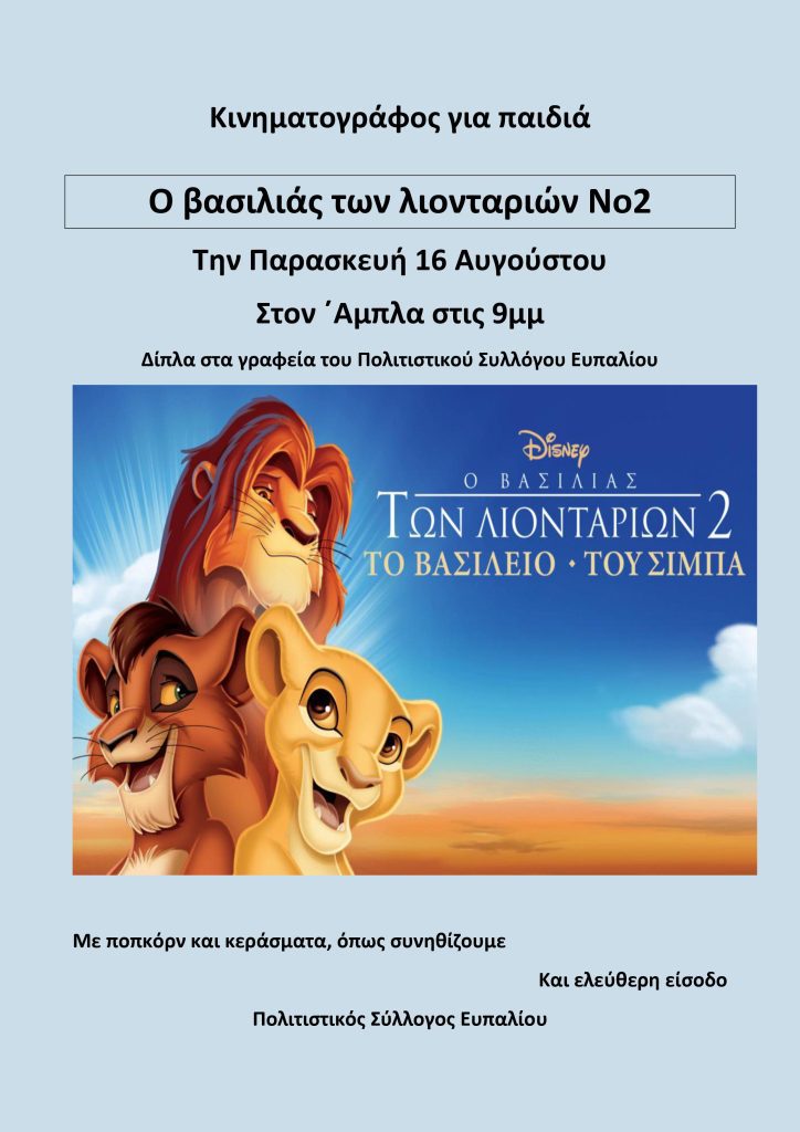 “Ο βασιλιάς των λιονταριών” κινηματογραφική ταινία για παιδιά από τον Πολιτιστικό Σύλλογο Ευπαλίου ΚΟΙΝΩΝΙΚΑ Από doridanews Στις Αυγ 15, 2024 Share - Διαφήμιση -Χρόνος ανάγνωσης: 1 λεπτό Συνεχίστε να διαβάσετε- Διαφήμιση - Share