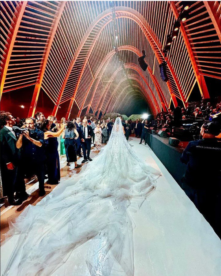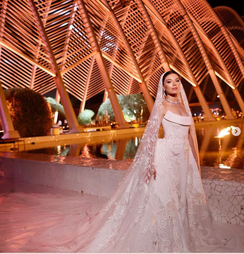 Η ίδια, ωστόσο, έκανε πριγκιπική εμφάνιση στη δεξίωση που ακολούθησε στο ΟΑΚΑ, με την ουρά του νυφικού της να απλώνεται για πολλά μέτρα.