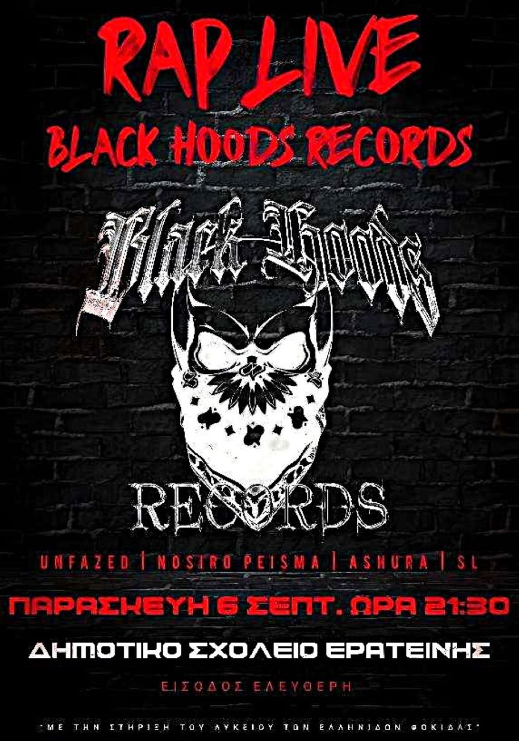 21:30 – 23:00 σας παρουσιάζουμε το συγκρότημα BLACK HOODS RECORDS, που απαρτίζεται από νέους ανθρώπους με καταγωγή από Ερατεινή!