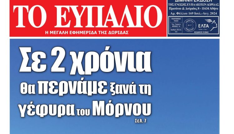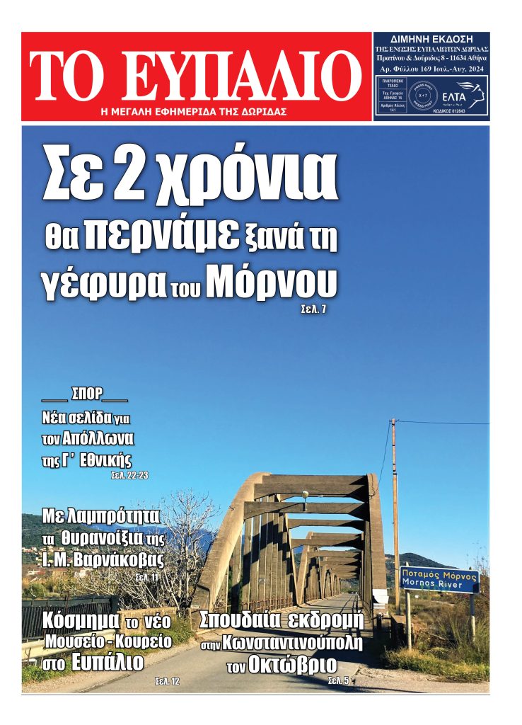 Με αναλυτικό ρεπορτάζ για την γέφυρα του Μόρνου, που μπήκαν οι υπογραφές για την αποκατάστασή της, αλλά θα ολοκληρωθούν τα έργα σε 2 χρόνια ώστε να ξανανοίξει, κυκλοφόρησε το νέο φύλλο της εφημερίδας “ΤΟ ΕΥΠΑΛΙΟ”.