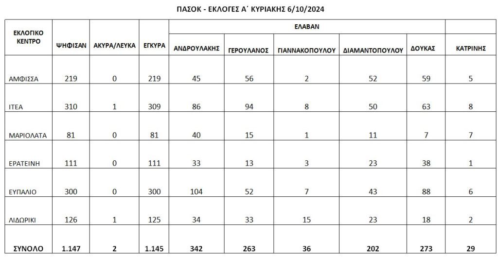 Πρώτος στη Φωκίδα ο Ανδρουλάκης, δεύτερος ο Δούκας – Αναλυτικά αποτελέσματα σε κάθε εκλογικό τμήμα