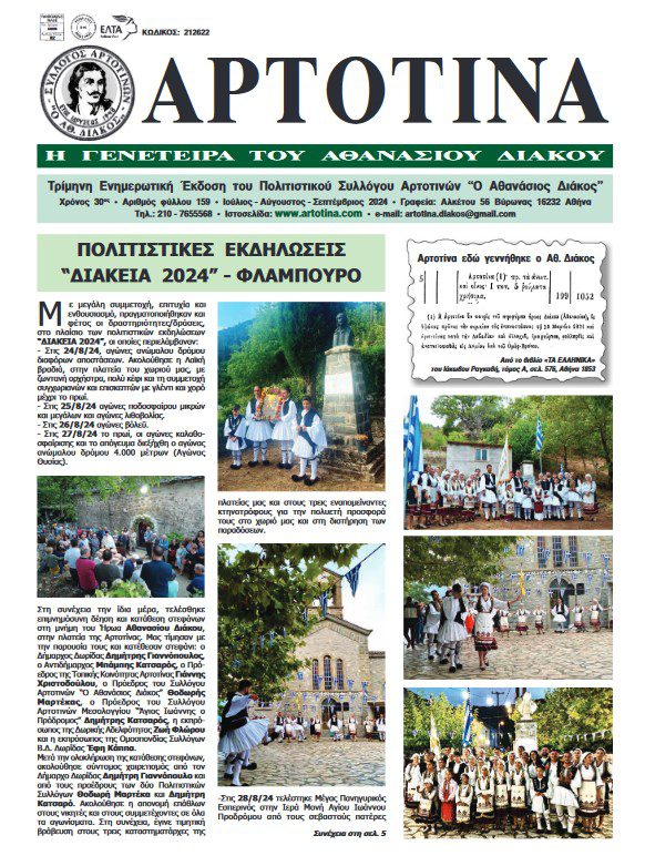 Με πλούσια ύλη από τα καλοκαιρινά δρώμενα στην Αρτοτίνα κυκλοφόρησε σε ηλεκτρονική μορφή η εφημερίδα «Αρτοτίνα» του Συλλόγου Αρτοτινών ο Αθανάσιος Διάκος.