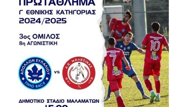 Κρίσιμο για τη συνέχεια του πρωταθλήματος αγώνα δίνει την Κυριακή στο Δημοτικό γήπεδο Μαλαμάτων ο Απόλλων Ευπαλίου Tihio Race απέναντι στην ΑΕ Μαλεσίνας για την 8η αγωνιστική του πρωταθλήματος της Γ’ Εθνικής (3ος Όμιλος)