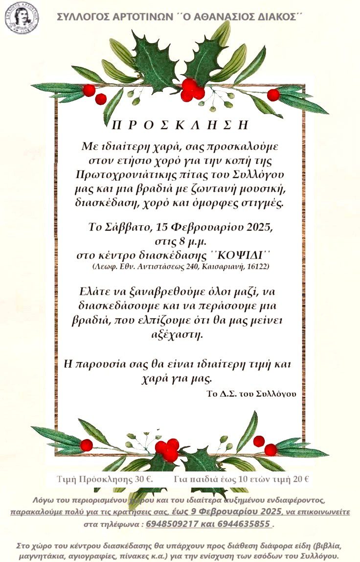 Είμαστε στην ευχάριστη θέση να σας προσκαλέσουμε, στη γιορτή που διοργανώνει ο Σύλλογός μας, για την κοπή της Πρωτοχρονιάτικης πίτας μας, στο κέντρο διασκέδασης ΄΄ΚΟΨΙΔΙ΄΄ (Λεωφ. Εθν. Αντιστάσεως 240, Καισαριανή),