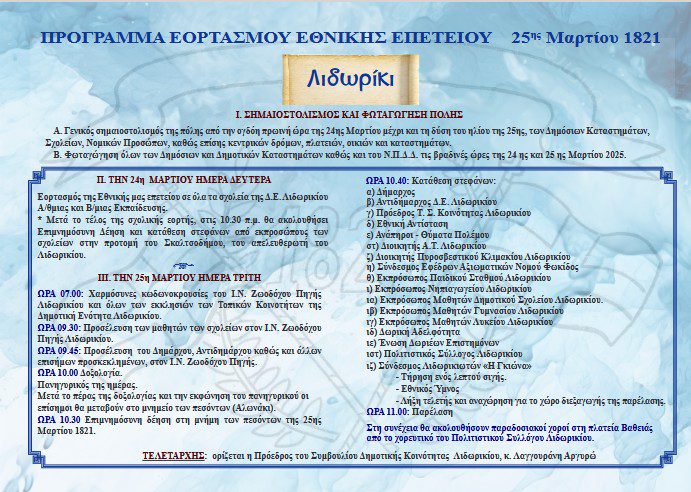 25η ΜΑΡΤΙΟΥ : Επετειακές εκδηλώσεις Δήμου Δωρίδας ΔΗΜΟΤΙΚΑ Από doridanews Στις Μαρ 22, 2025 Share - Διαφήμιση -Χρόνος ανάγνωσης: 4 λεπτά Συνεχίστε να διαβάσετε- Διαφήμιση - Share