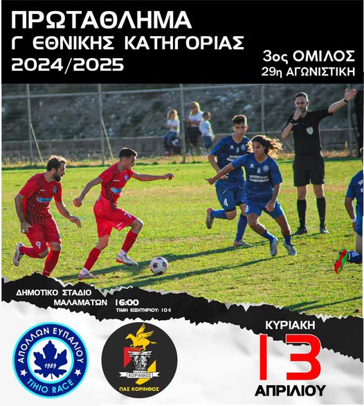 Τον τελευταίο αγώνα στο γήπεδό του δίνει την Κυριακή ο Απόλλων Ευπαλίου Tihio Race απέναντι στην ισχυρή Κόρινθο για το πρωτάθλημα της Γ’ Εθνικής (3ος  Όμιλος).
