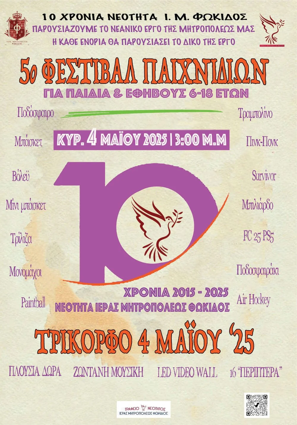 Την Κυριακή 4 Μαΐου 2025 και ώρα 3:00 μ.μ., στο Τρίκορφο Δωρίδος θα πραγματοποιηθεί το 5ο Φεστιβάλ Παιχνιδιών και η γιορτή για τα 10 χρόνια Νεότητα Ι. Μητροπόλεως Φωκίδος που διοργανώνει το Γραφείο Νεότητας της Ι. Μητροπόλεώς μας.