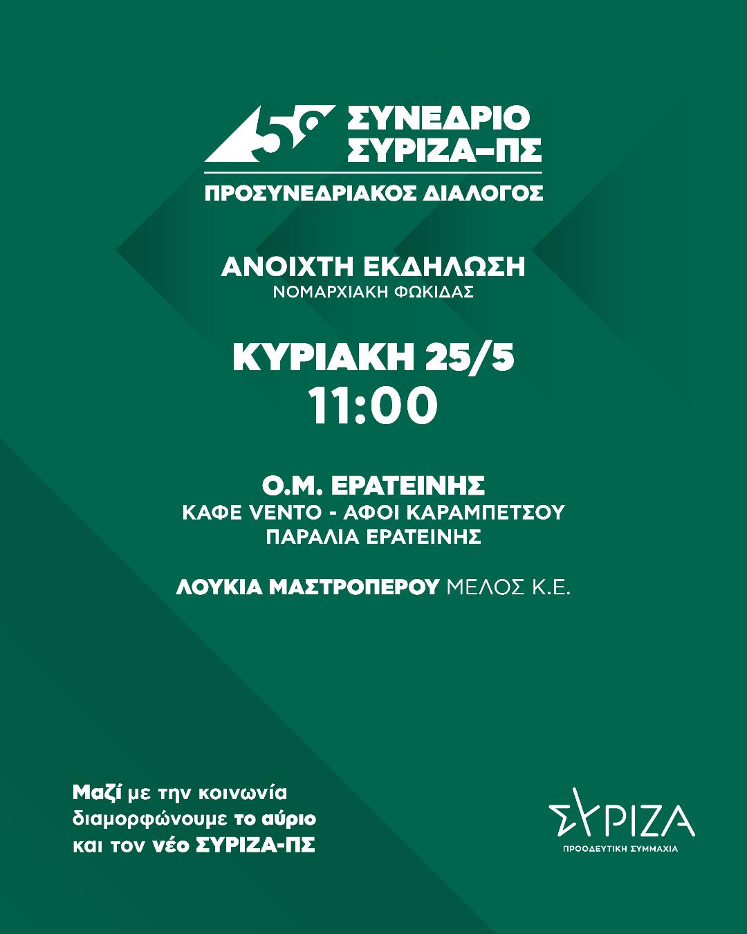 Η Νομαρχιακή Επιτροπή ΣΥΡΙΖΑ – ΠΣ Φωκίδας σας προσκαλεί σε πολιτική εκδήλωση στα πλαίσια του προσυνεδριακού διαλόγου την Κυριακή 25/5 και ώρα 11.00 το πρωί στο καφέ VENTO (Αφοί Καραμπέτσου) στην Παραλία Ερατεινής.