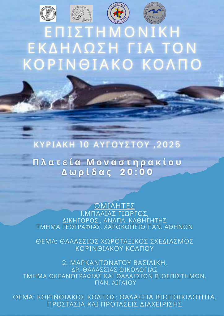 Σας προσκαλούμε στην επιστημονική εκδήλωση με θέμα τον Κορινθιακό Κόλπο, η οποία θα πραγματοποιηθεί την Κυριακή 10 Αυγούστου 2025, στις 20:00, στην πλατεία Μοναστηρακίου Δωρίδας.