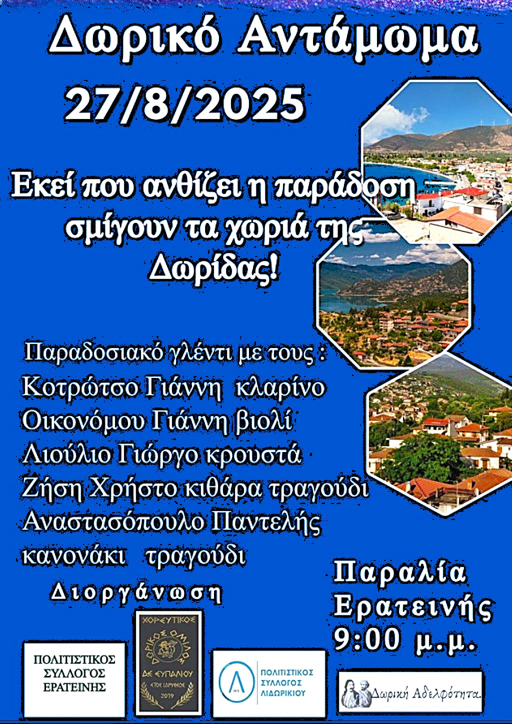 Η Δωρίδα δίνει ραντεβού αποχαιρετώντας το καλοκαίρι . Την Τετάρτη 27 Αυγούστου 2025, στις 9:00 μ.μ., στην Παραλία Ερατεινής, διοργανώνεται το «Δωρικό Αντάμωμα», μια μεγάλη γιορτή που ενώνει τους ανθρώπους, τα χωριά και τις παραδόσεις μας.