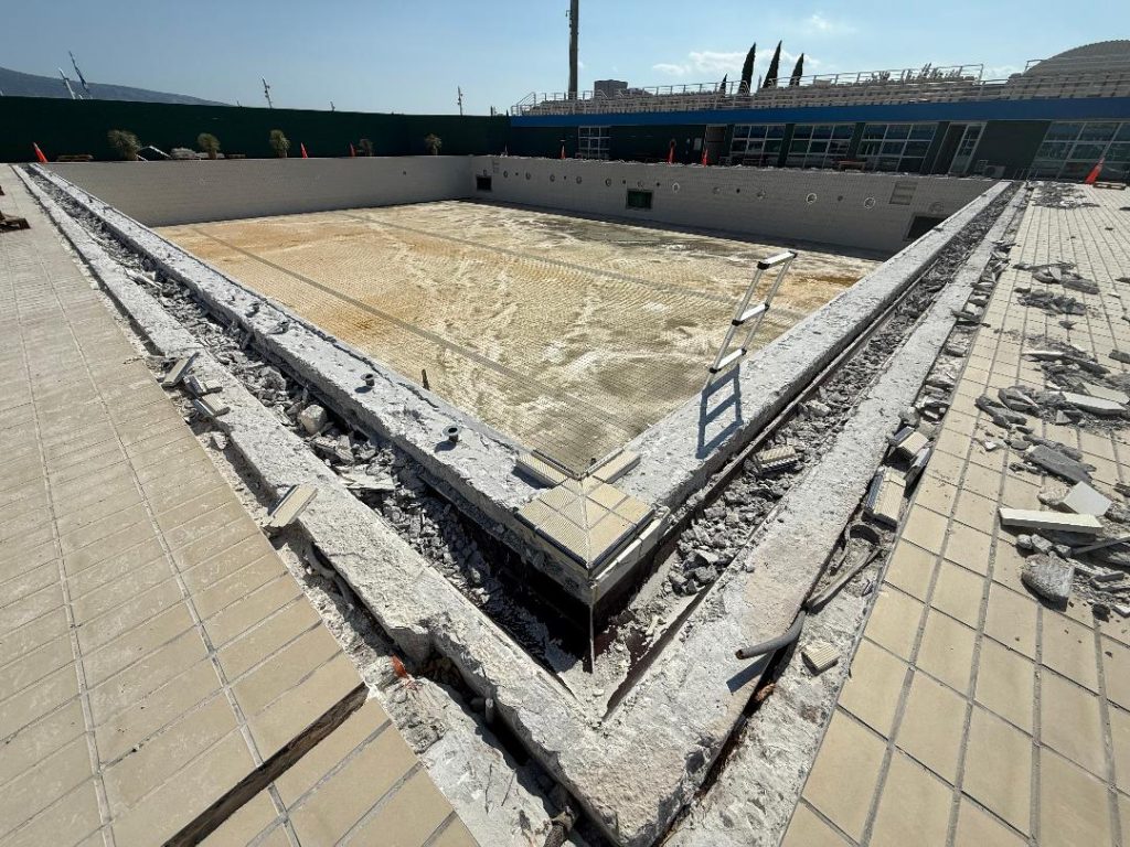 Στις κολυμβητικές δεξαμενές συνεχίζονται οι παρεμβάσεις με καθαίρεση σαθρών επιφανειών σκυροδέματος, αποκατάσταση και ενίσχυση του οπλισμού, ριζική ανακατασκευή του καναλιού υπερχείλισης, καθώς και εκτεταμένες επισκευές σε πλακίδια και υδραυλικές εγκαταστάσεις.