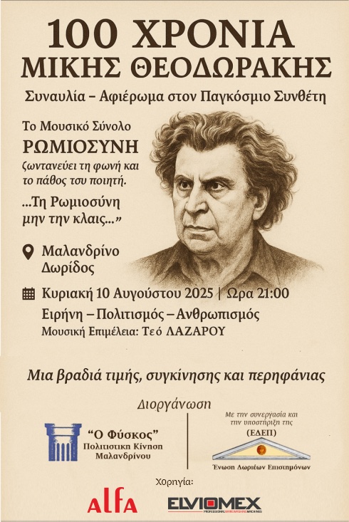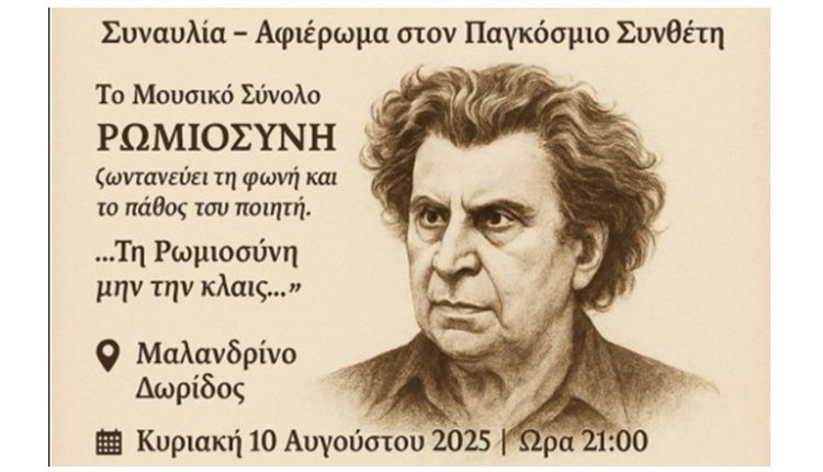 ΜΑΛΑΝΔΡΙΝΟ: Συναυλία αφιέρωμα στο Μίκη Θεοδωράκη ΠΟΛΙΤΙΣΜΟΣ Από doridanews Στις Αυγ 9, 2025 Share - Διαφήμιση -Χρόνος ανάγνωσης: 1 λεπτό Συνεχίστε να διαβάσετε- Διαφήμιση - Share