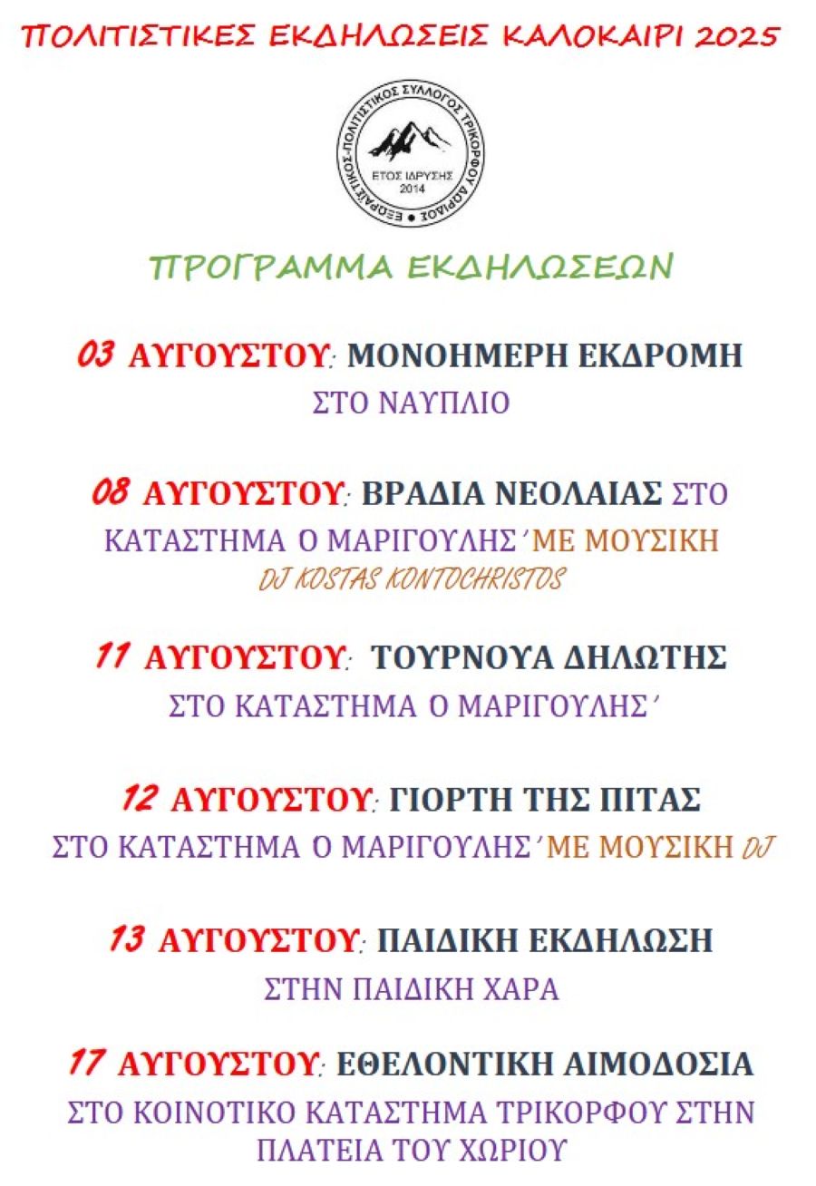 Οι Καλοκαιρινές εκδηλώσεις 2025 του Πολιτιστικού Συλλόγου Τρικόρφου Δωρίδος ΠΟΛΙΤΙΣΜΟΣ Από doridanews Στις Αυγ 1, 2025 Share - Διαφήμιση -Χρόνος ανάγνωσης: 1 λεπτό Συνεχίστε να διαβάσετε- Διαφήμιση - Share