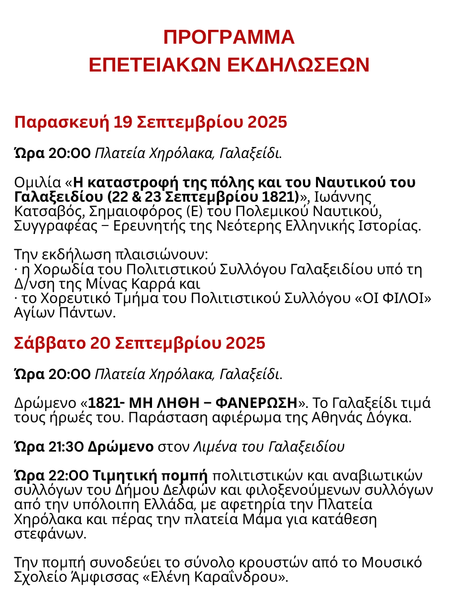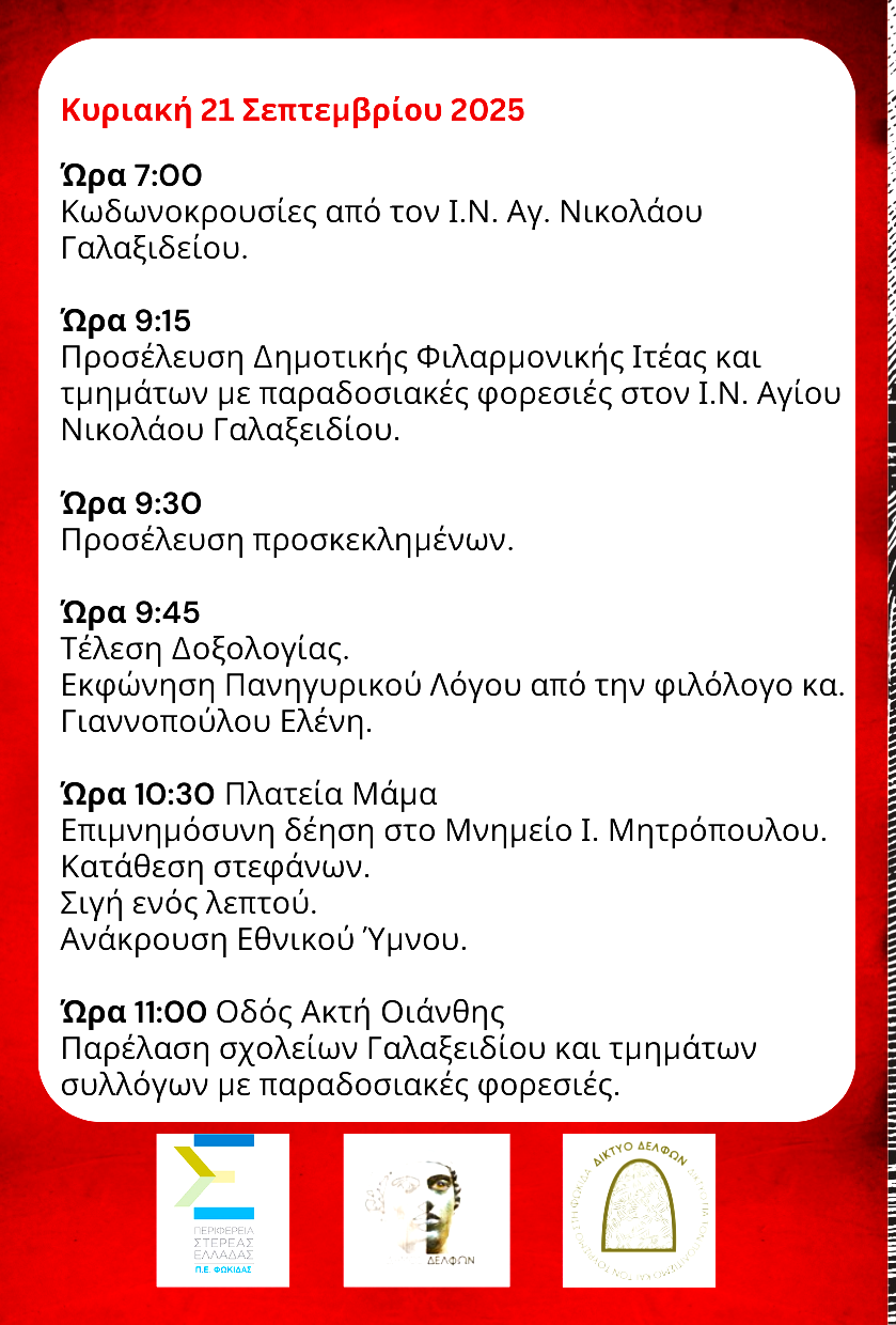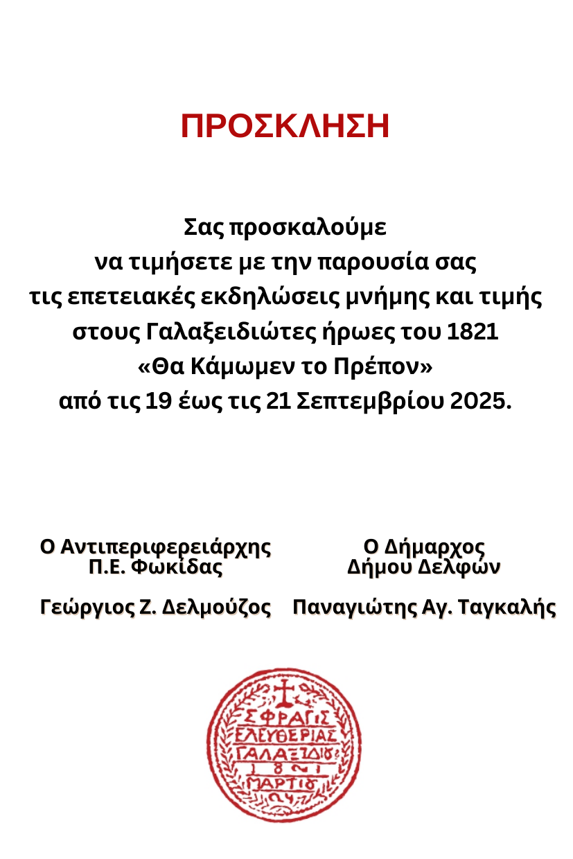 Εκδηλώσεις στο Γαλαξίδι για τους ήρωες του 1821 ΠΟΛΙΤΙΣΜΟΣ Από doridanews Στις Σεπ 16, 2025 Share - Διαφήμιση -Χρόνος ανάγνωσης: 3 λεπτά Συνεχίστε να διαβάσετε- Διαφήμιση - Share