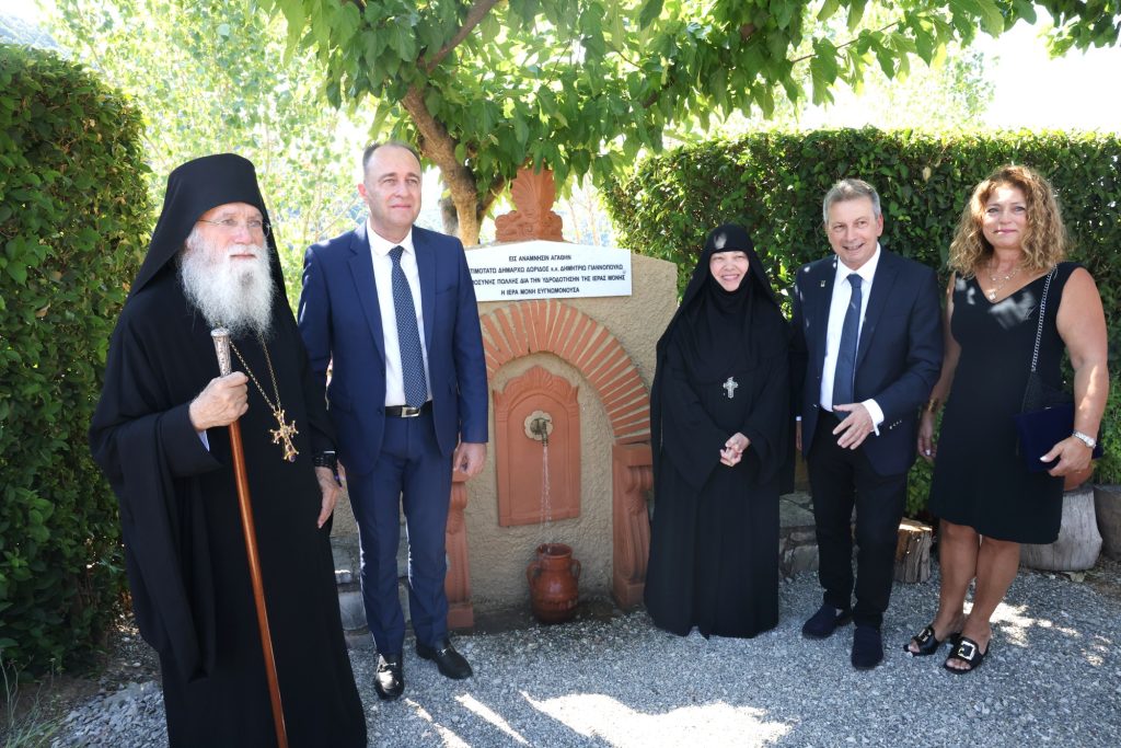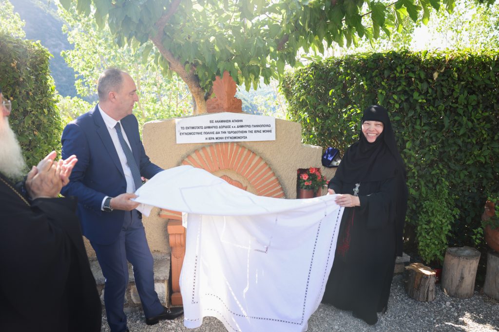 Κατά τη διάρκεια της τελετής, ο Σεβασμιώτατος απηύθυνε έναν σύντομο λόγο προς τον Δήμαρχο και εκτός των άλλων είπε: «Εκφράζουμε τη βαθιά ευγνωμοσύνη μας προς το πρόσωπό σας και τονίζουμε την αγάπης σας, όχι μόνο προς τούτο το μοναστήρι, αλλά και προς την τοπική μας Εκκλησία που στέκεστε αρωγός. Με το έργο αυτό, δεν φέρατε απλώς νερό στη Μονή, αλλά δροσίσατε τις ψυχές των μοναζουσών και συμβάλατε στο έργο της προσευχής τους για τον τόπο μας, καθώς και των πολυάριθμων προσκυνητών που την επισκέπτονται. Ο Θεός να σας χαρίζει δύναμη και φώτιση στο δύσκολο έργο που σας ανέθεσε ο λαός της τοπικής κοινωνίας και τη συνέχιση των έργων που κάνετε προς το λαό».