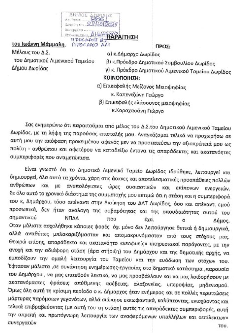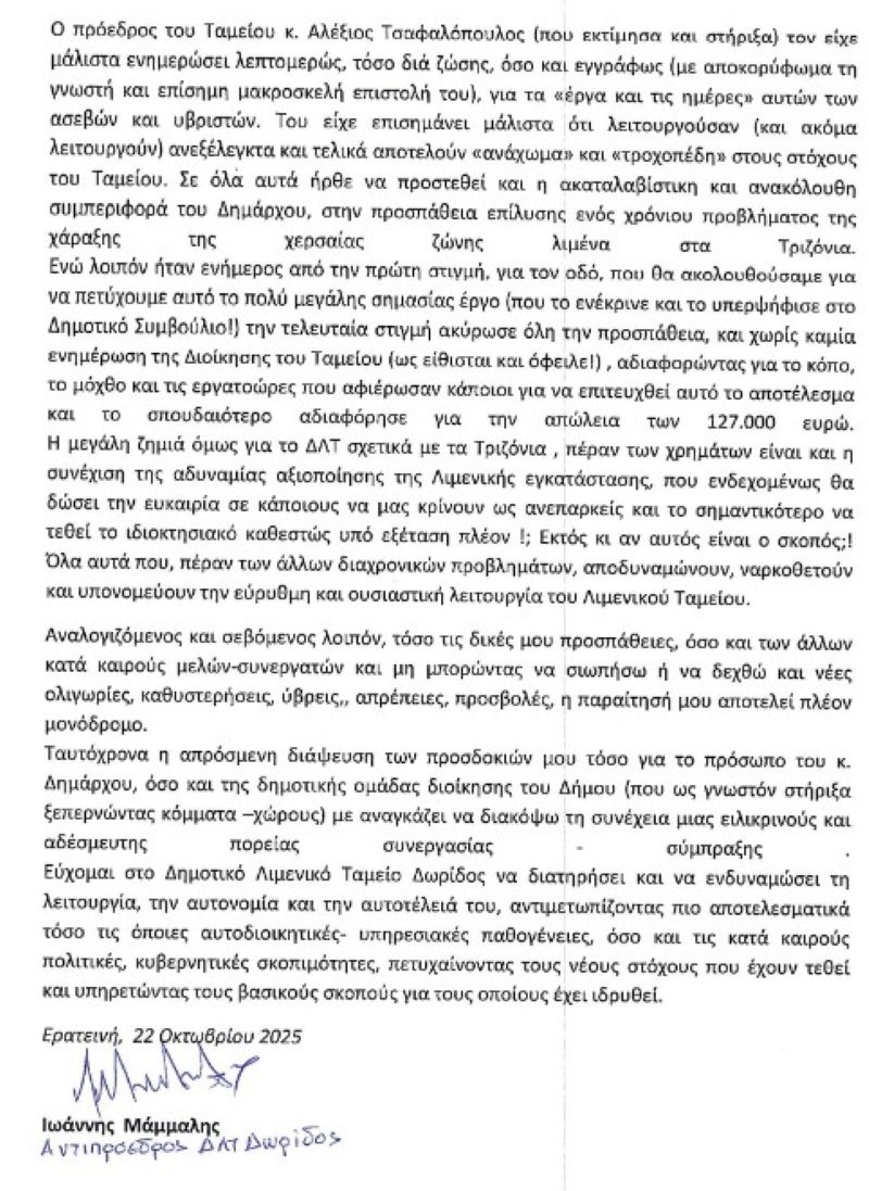 Με χοντρές αιχμές κατά του δημάρχου Δ. Γιαννόπουλου υπέβαλε την παραίτησή του από Αντιπρόεδρος του Λιμενικού Ταμείου Δωρίδας ο Αντιπρόεδρος Ιωάννης Μάμμαλης.
