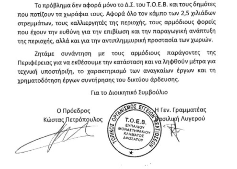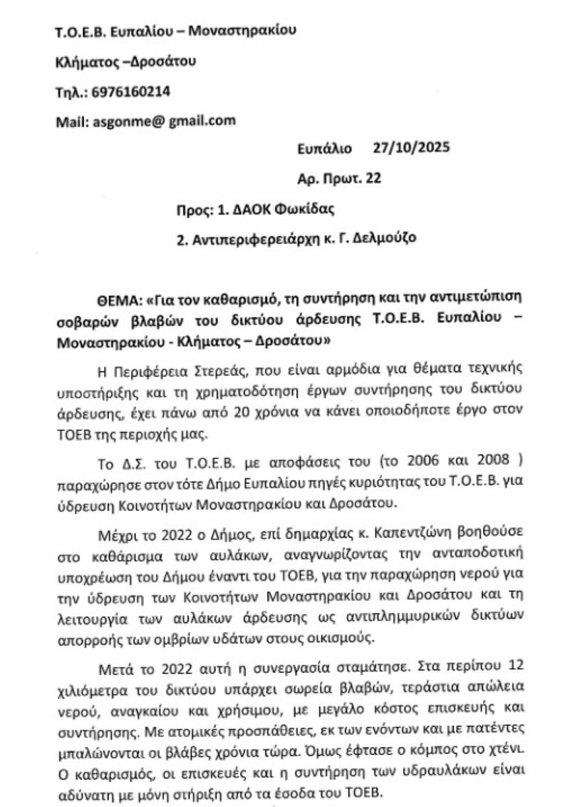 Τον καθαρισμό, την συντήρηση, και την αντιμετώπιση σοβαρών βλαβών του δικτύου άρδευσης του Τ.Ο.Ε.Β Ευπαλίου, Μοναστηρακίου, Κλήματος και Δροσάτου ζητά με επιστολή του ο Φορέας από τον Αντιπεριφερειάρχη Γιώργο Δελμούζο και τις αρμόδιες υπηρεσίες της Περιφέρειας.