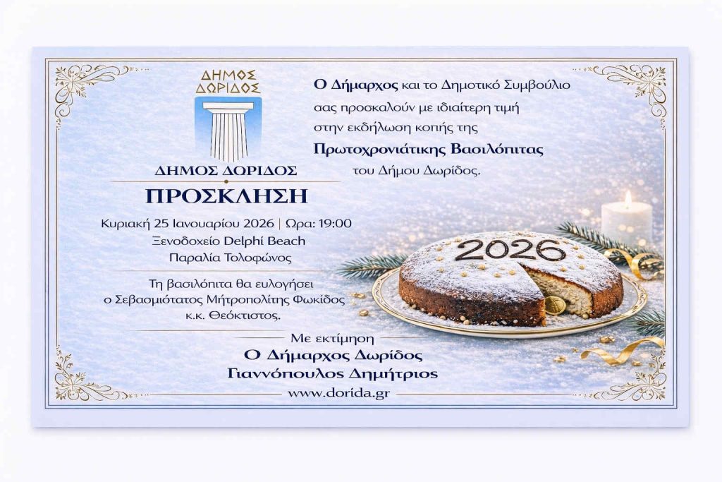 Την Κυριακή η κοπή πίτας 2026 του Δήμου Δωρίδας ΔΗΜΟΤΙΚΑ Από doridanews Στις Ιαν 21, 2026 Share - Διαφήμιση -Χρόνος ανάγνωσης: 1 λεπτό Συνεχίστε να διαβάσετε- Διαφήμιση - Share