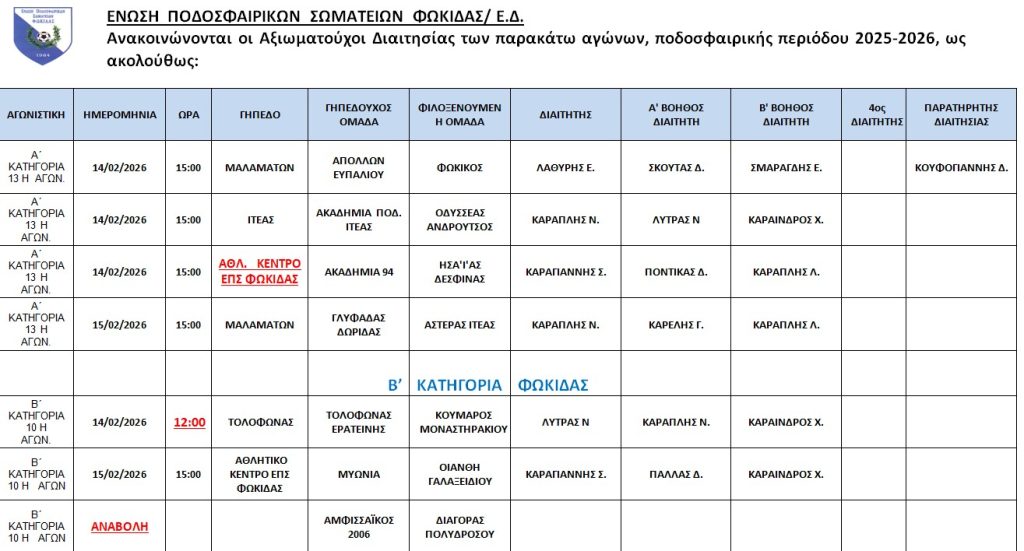 ΔΙΑΙΤΗΤΕΣ ΚΑΙ ΩΡΕΣ ΤΩΝ ΑΓΩΝΩΝ ΤΟΥ ΣΑΒΒΑΤΟΚΥΡΙΑΚΟΥ