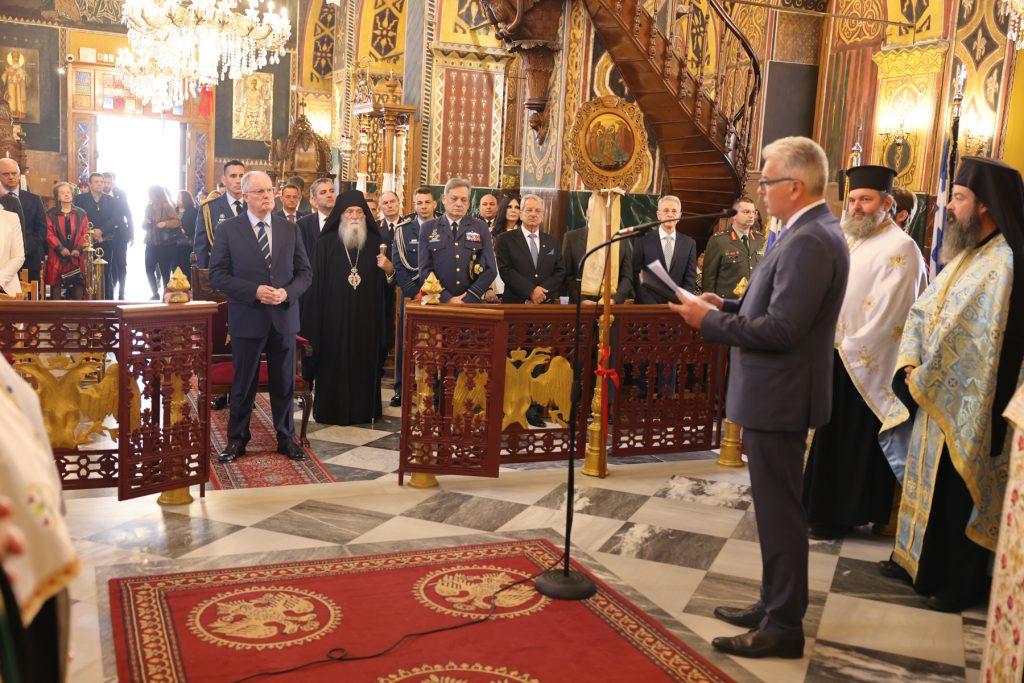 Στη συνέχεια, στην πλατεία Ησαΐα ακολούθησε επιμνημόσυνη δέηση στον Αδριάντα του Επισκόπου Σαλώνων Ησαΐα και κατάθεση στεφάνου από την Α.Ε. τον Πρόεδρο της Δημοκρατίας και η τήρηση ενός λεπτού σιγής στη μνήμη των Ηρώων.